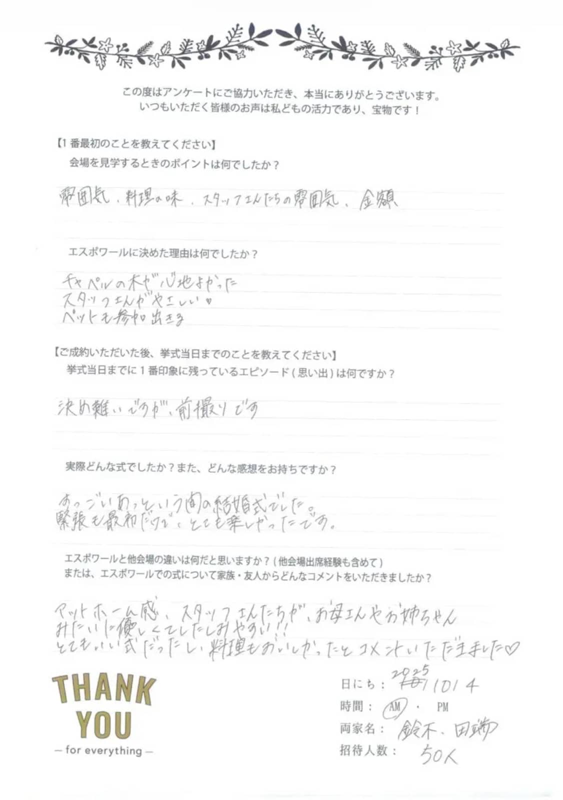 とてもいい式だったし、料理もおいしかったとコメントいただきました♡